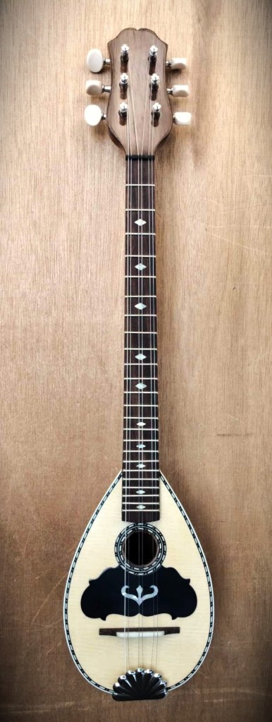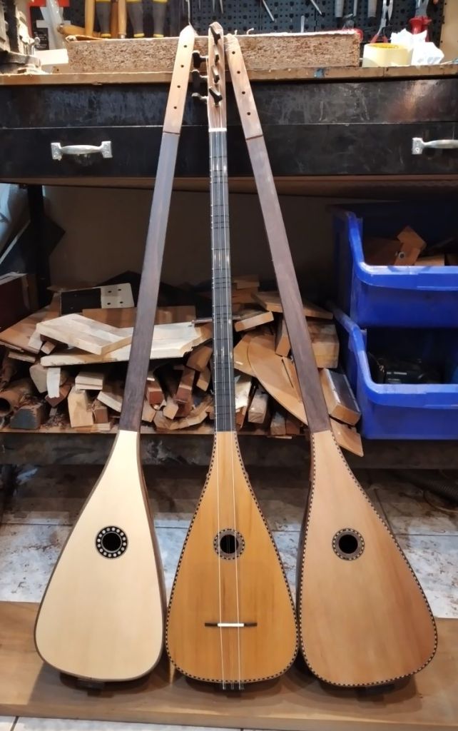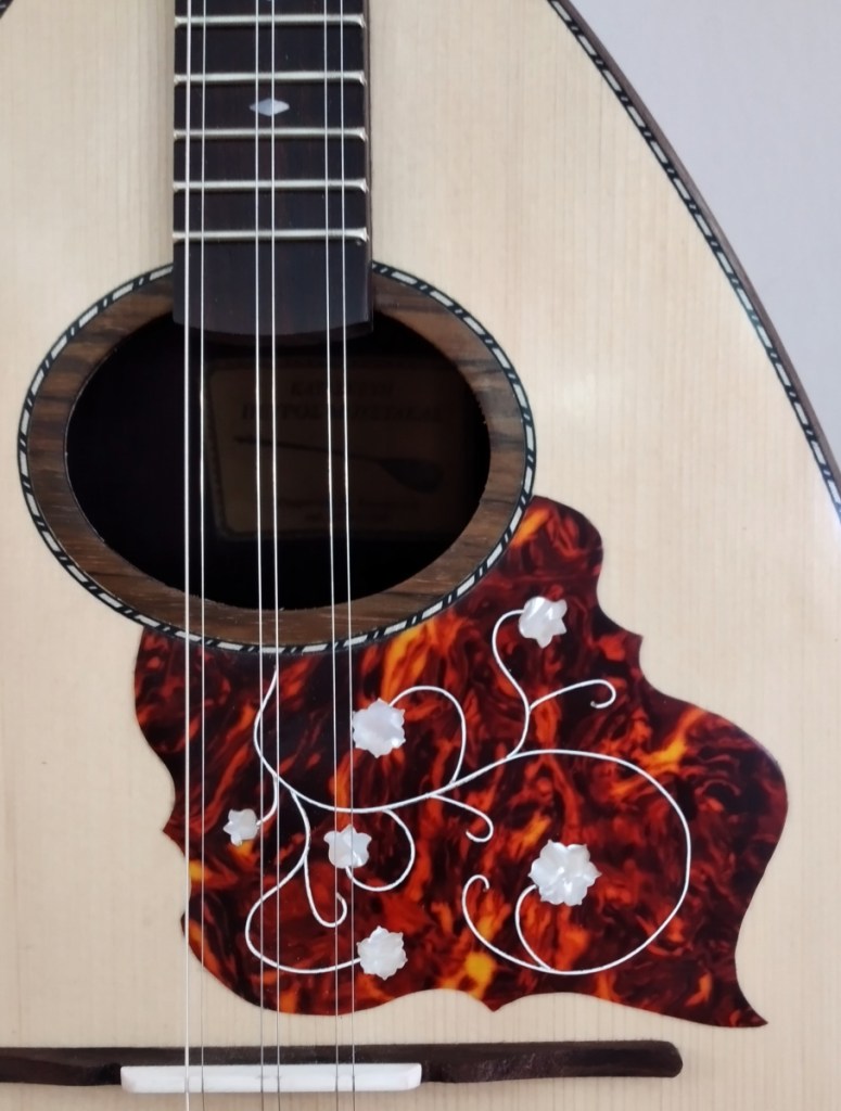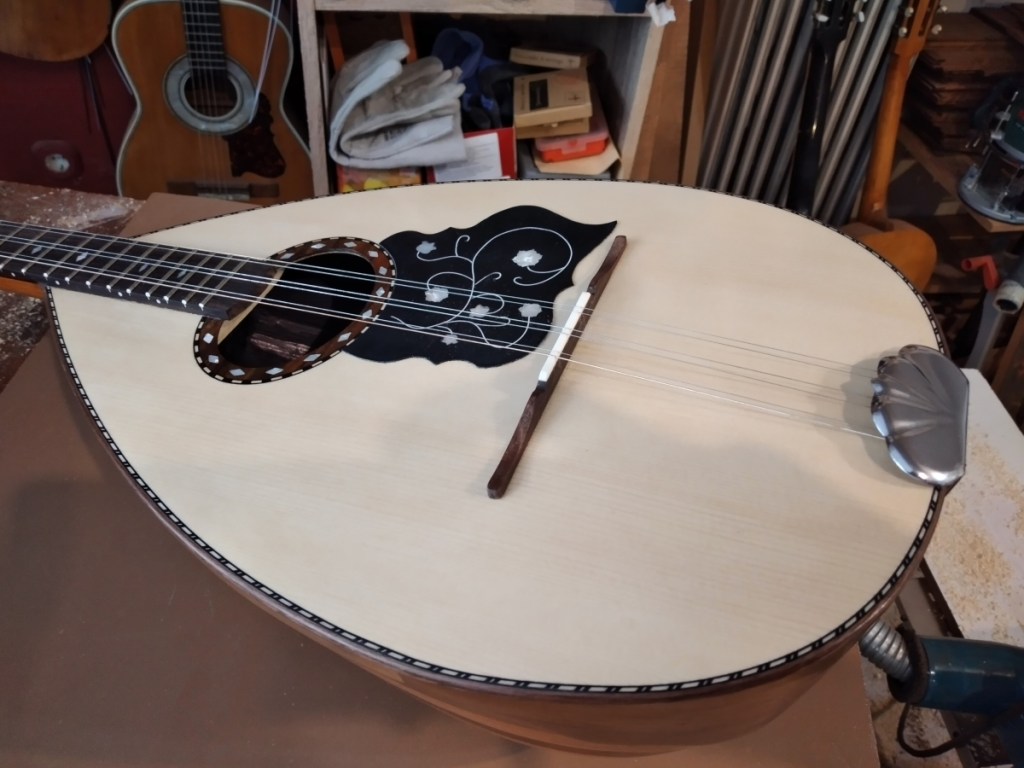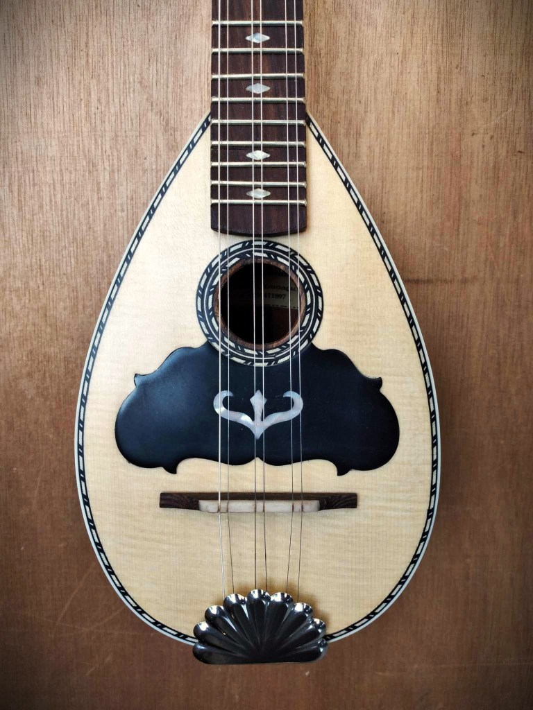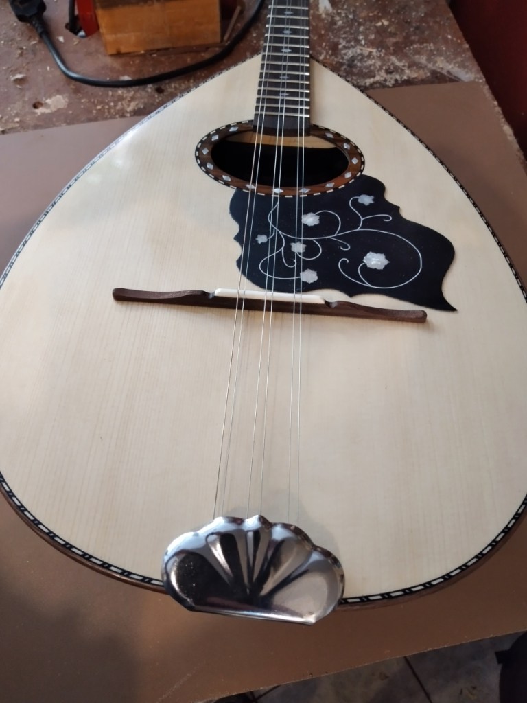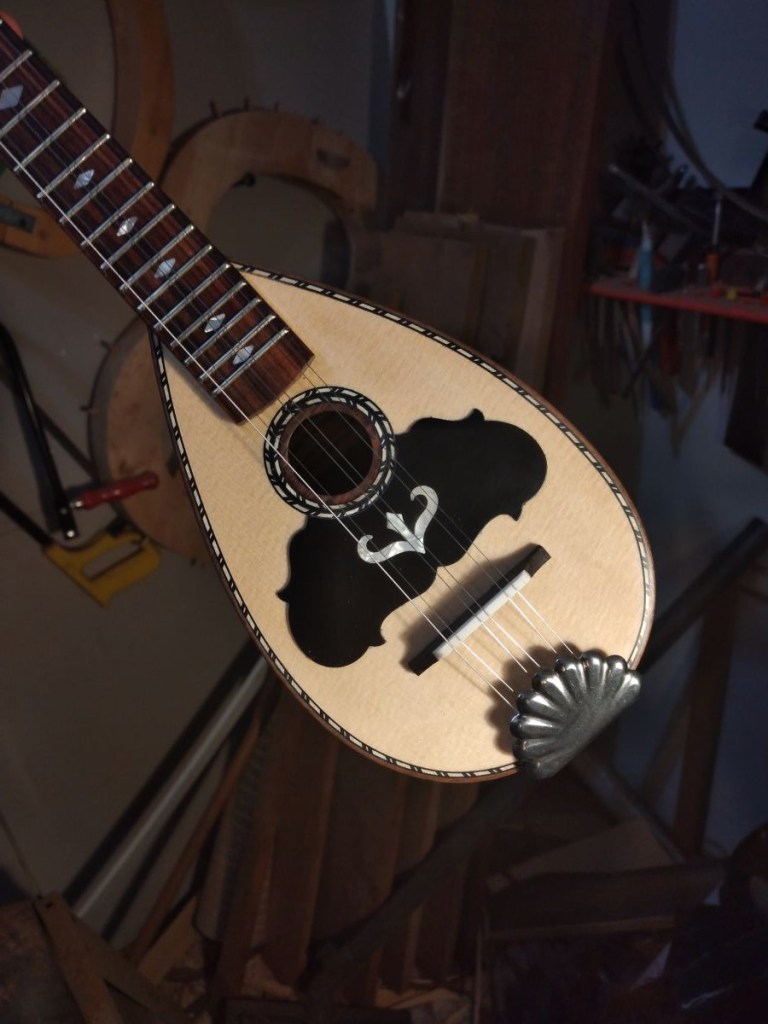 Μήκος χορδής: 66 cm, σκάφος: καρυδιά-αφρικανικό μαόνι, μπράτσο: αφρικανικό μαόνι με κόντρες βέγκε-παντούκ, καπάκι: έλατο, ταστιέρα και καβαλάρης: παλίσανδρος, επένδυση καράολου: καρυδιά, πεναριά: ασετόπαστα.