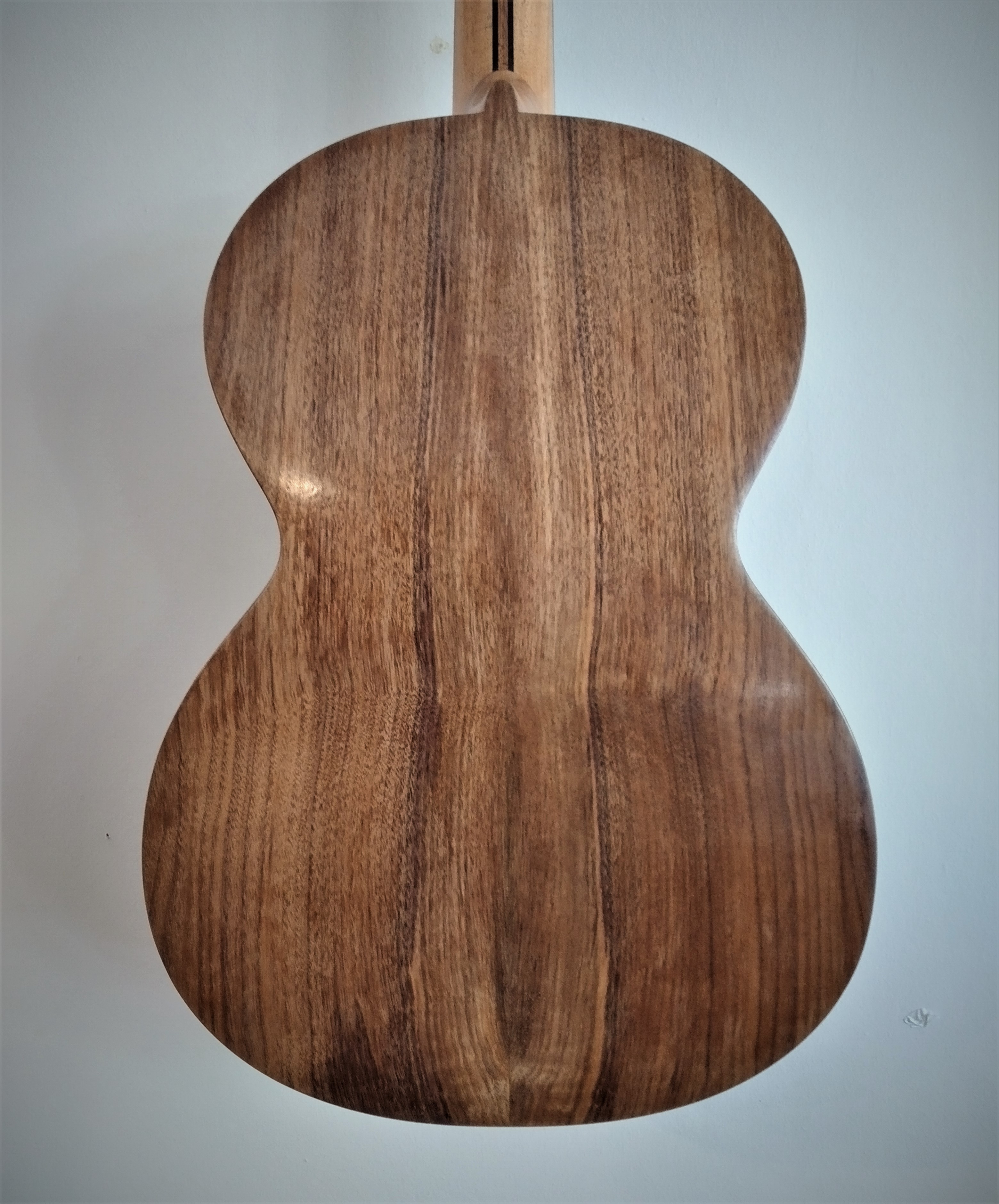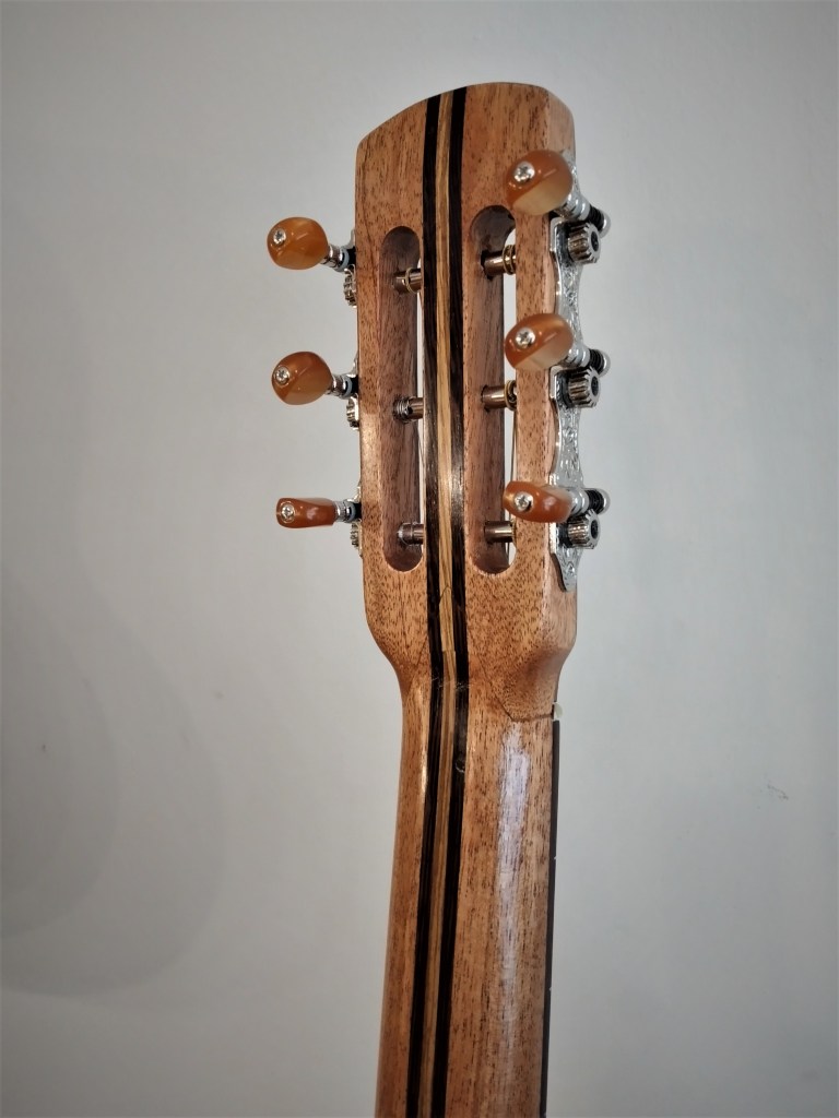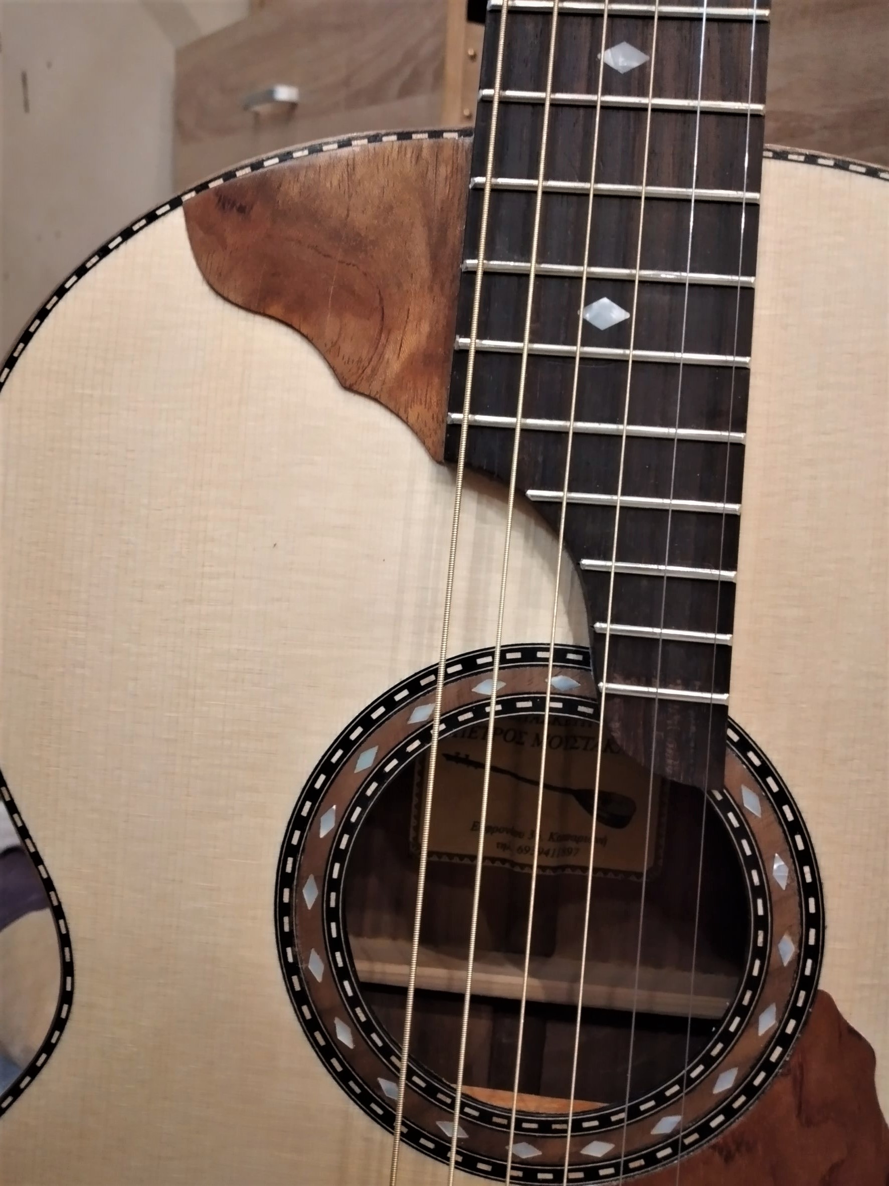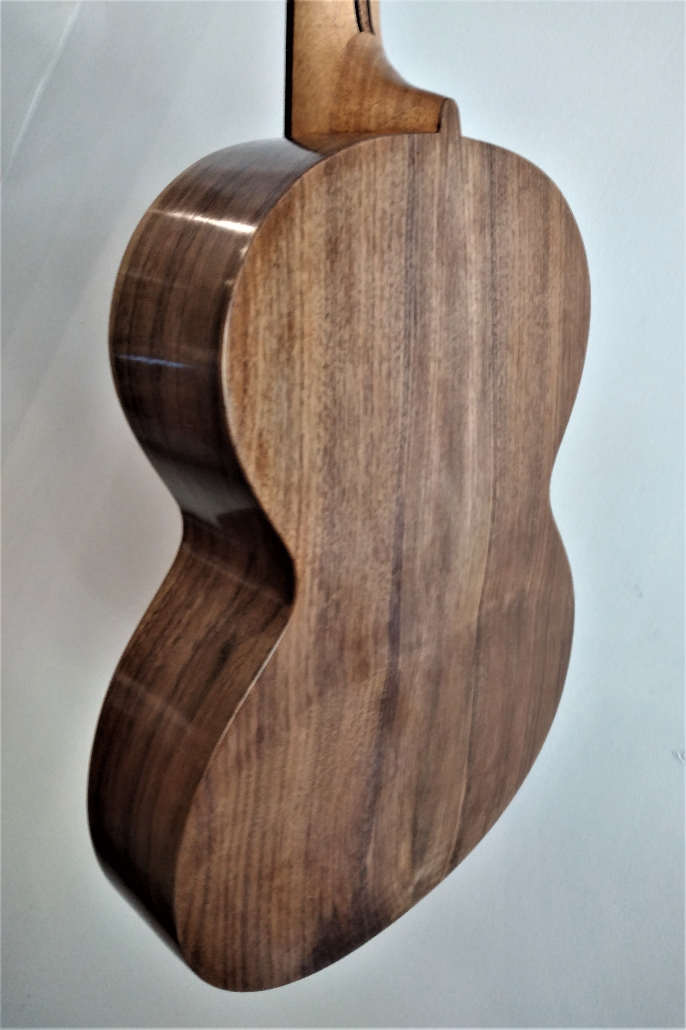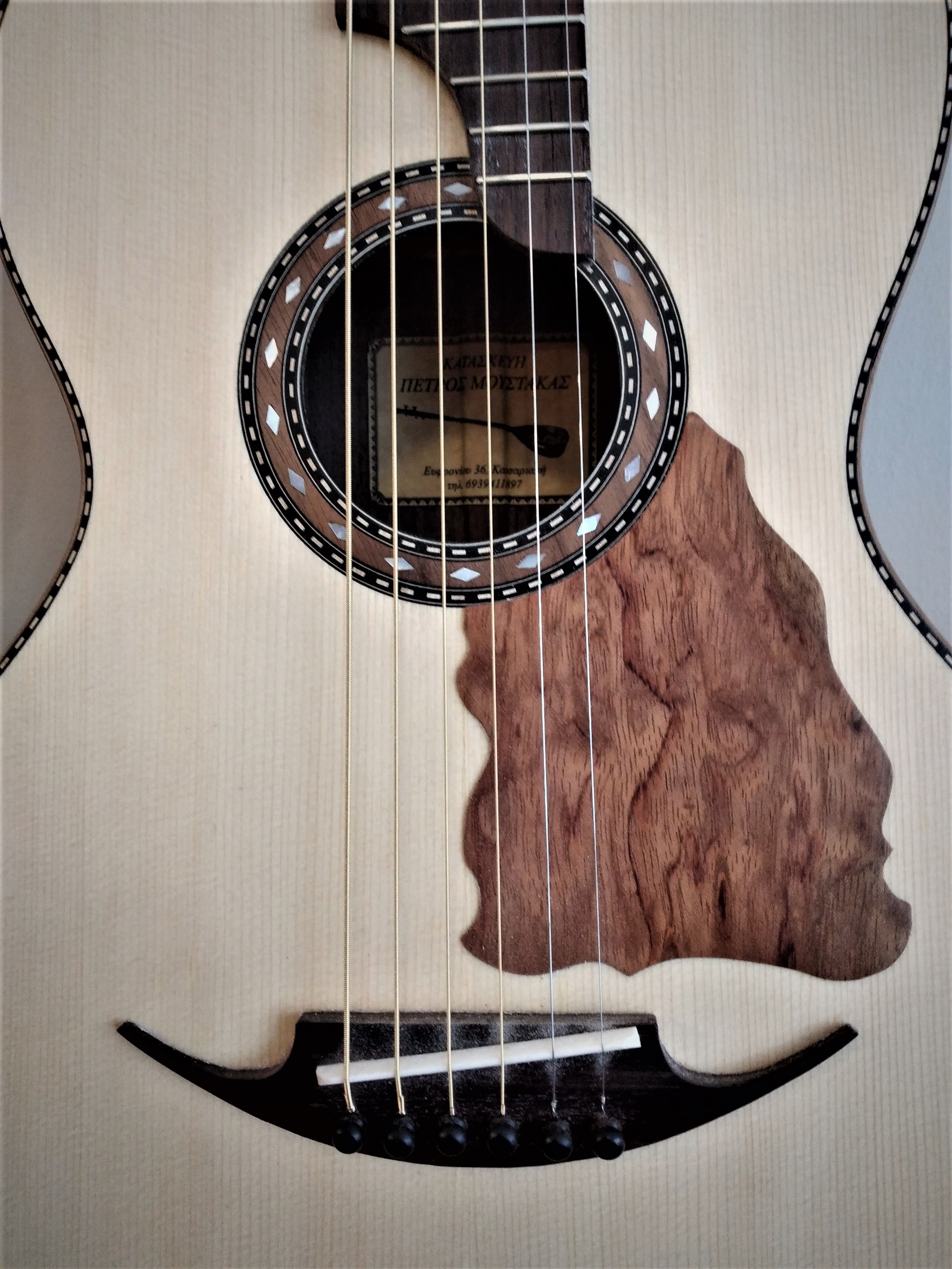 Μήκος χορδής: 63 cm. Σκάφος: καρυδιά, μπράτσο: αφρικανικό μαόνι με κόντρες όβανγκολ, καπάκι: έλατο, ταστιέρα και καβαλάρης: παλίσανδρος.