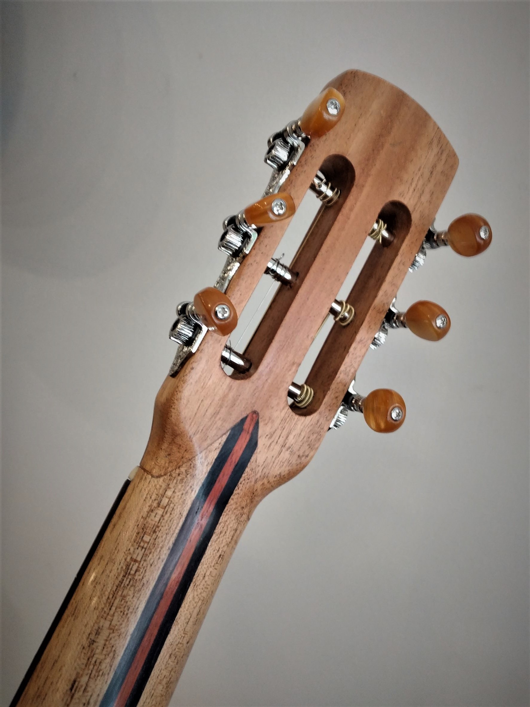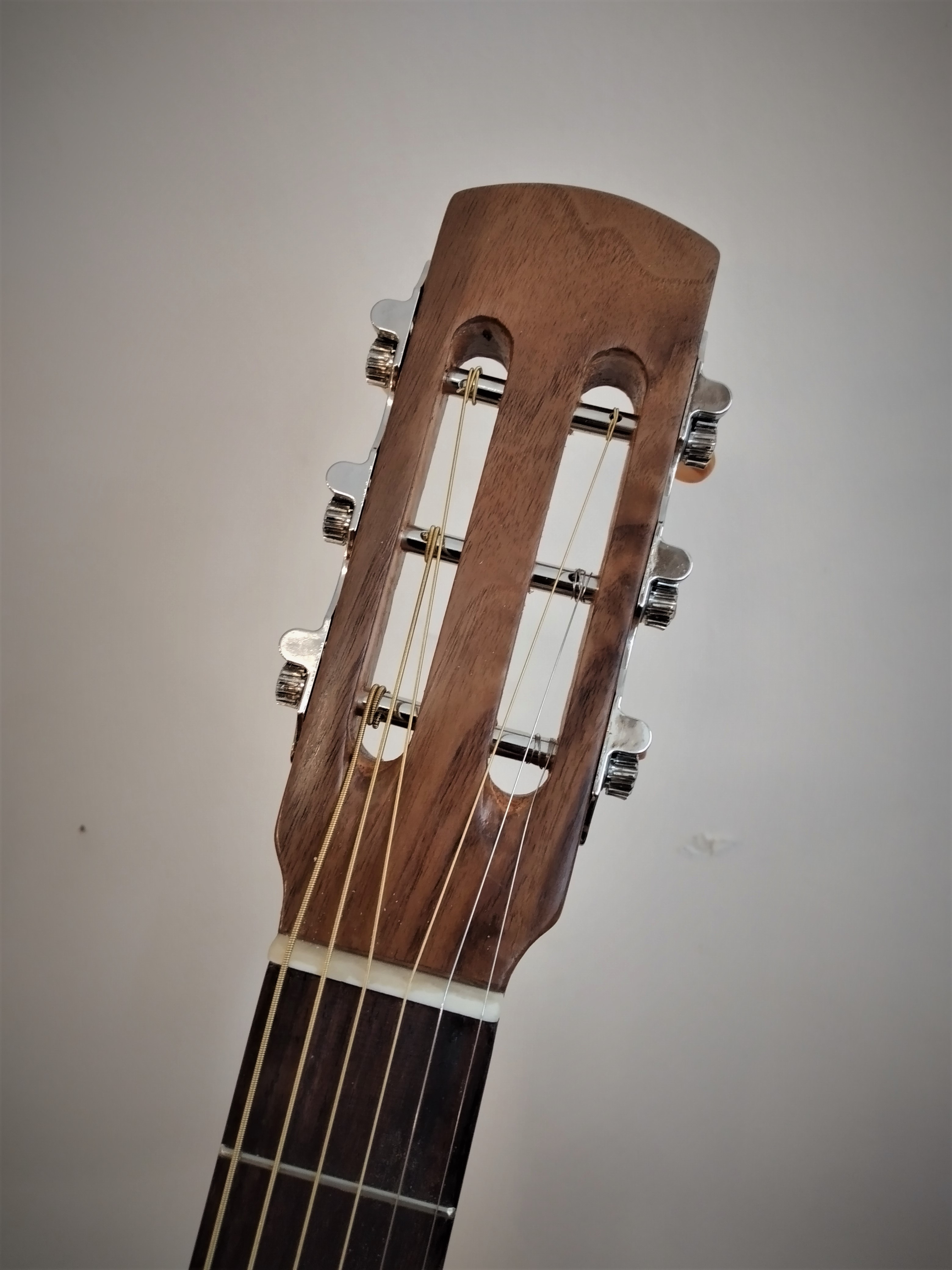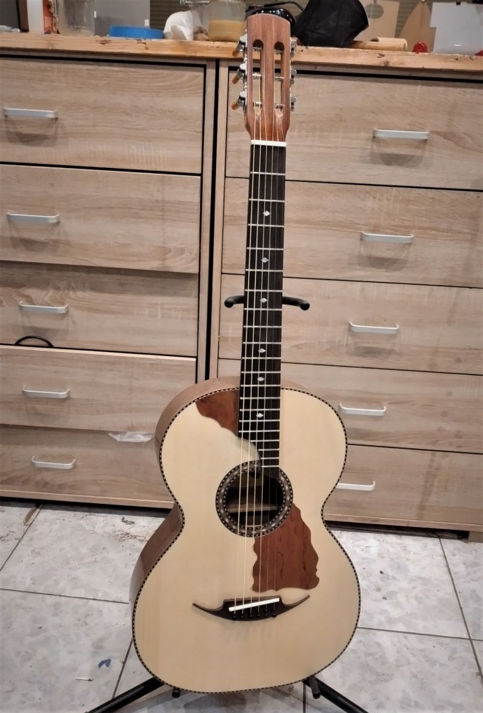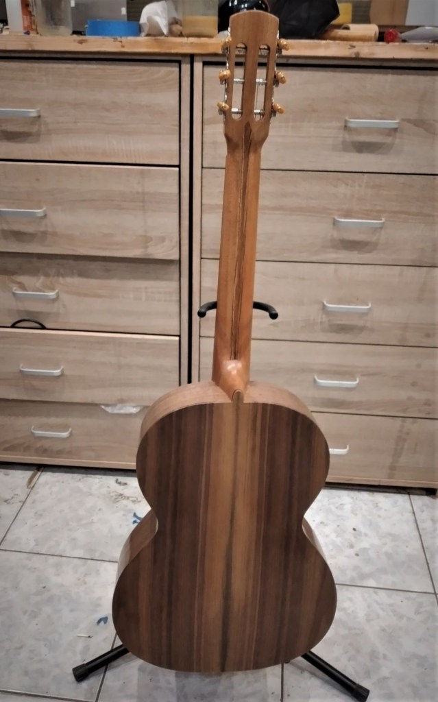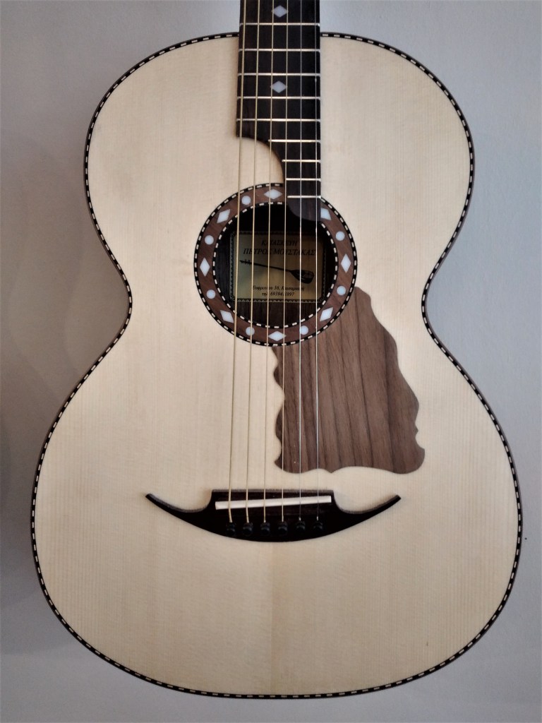 Μήκος χορδής: 63 cm. Σκάφος: καρυδιά, μπράτσο: αφρικανικό μαόνι με κόντρες όβανγκολ, καπάκι: έλατο, ταστιέρα και καβαλάρης: παλίσανδρος.