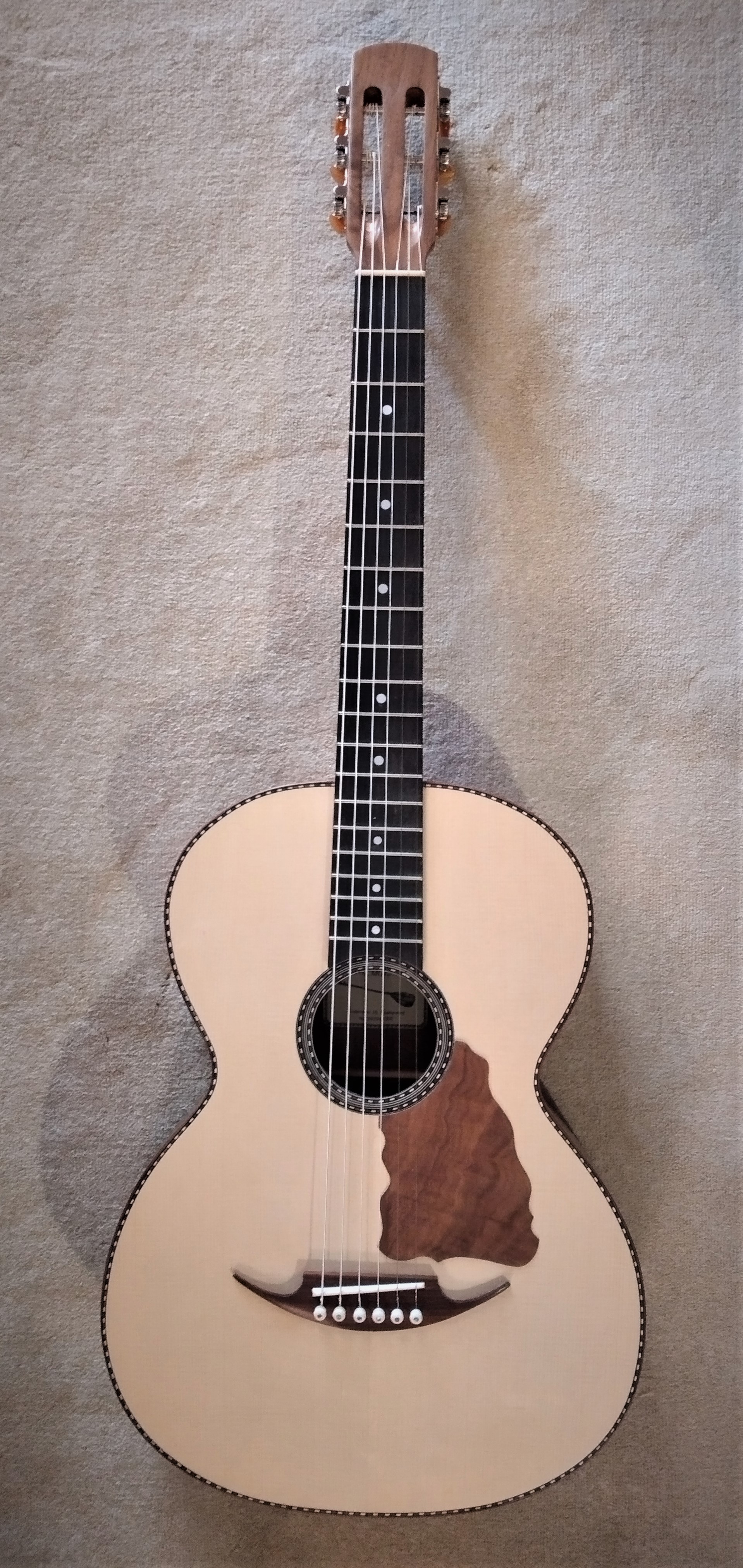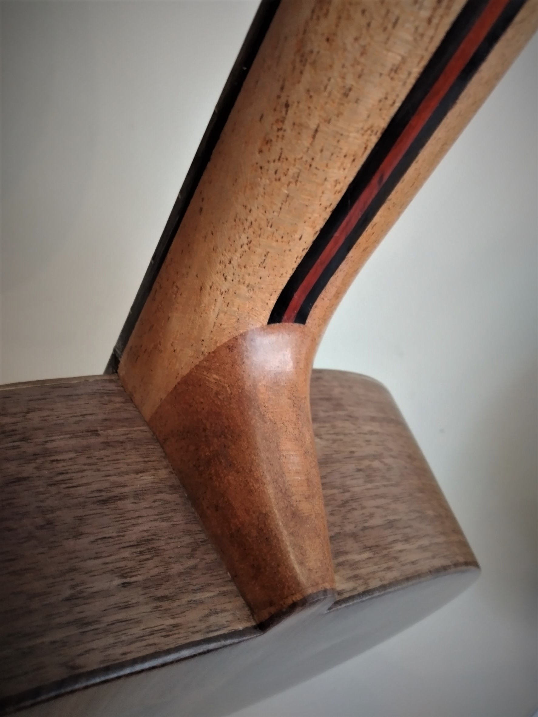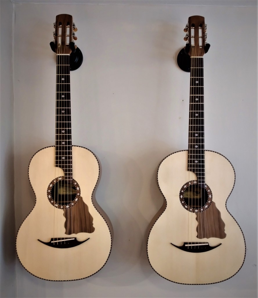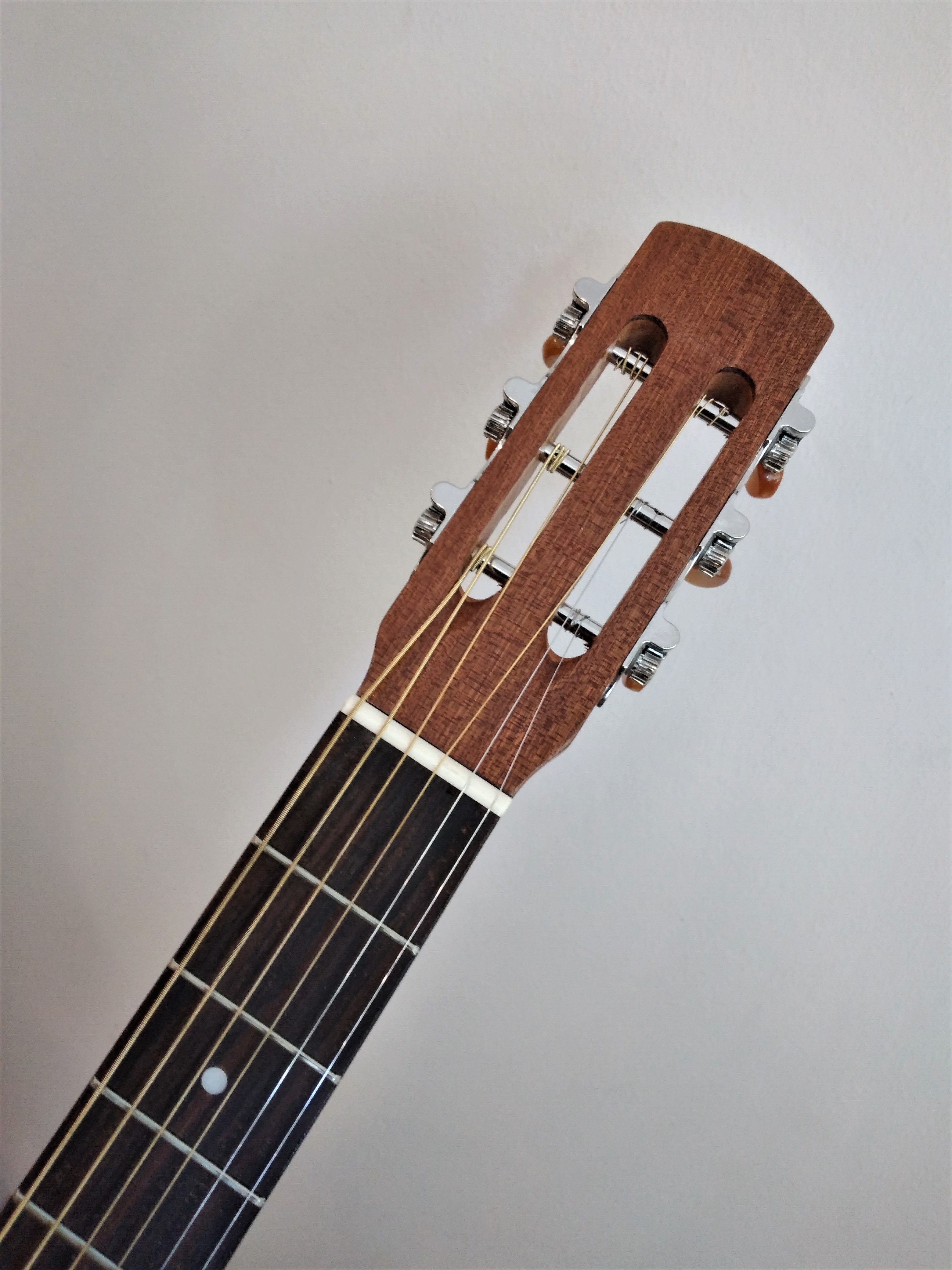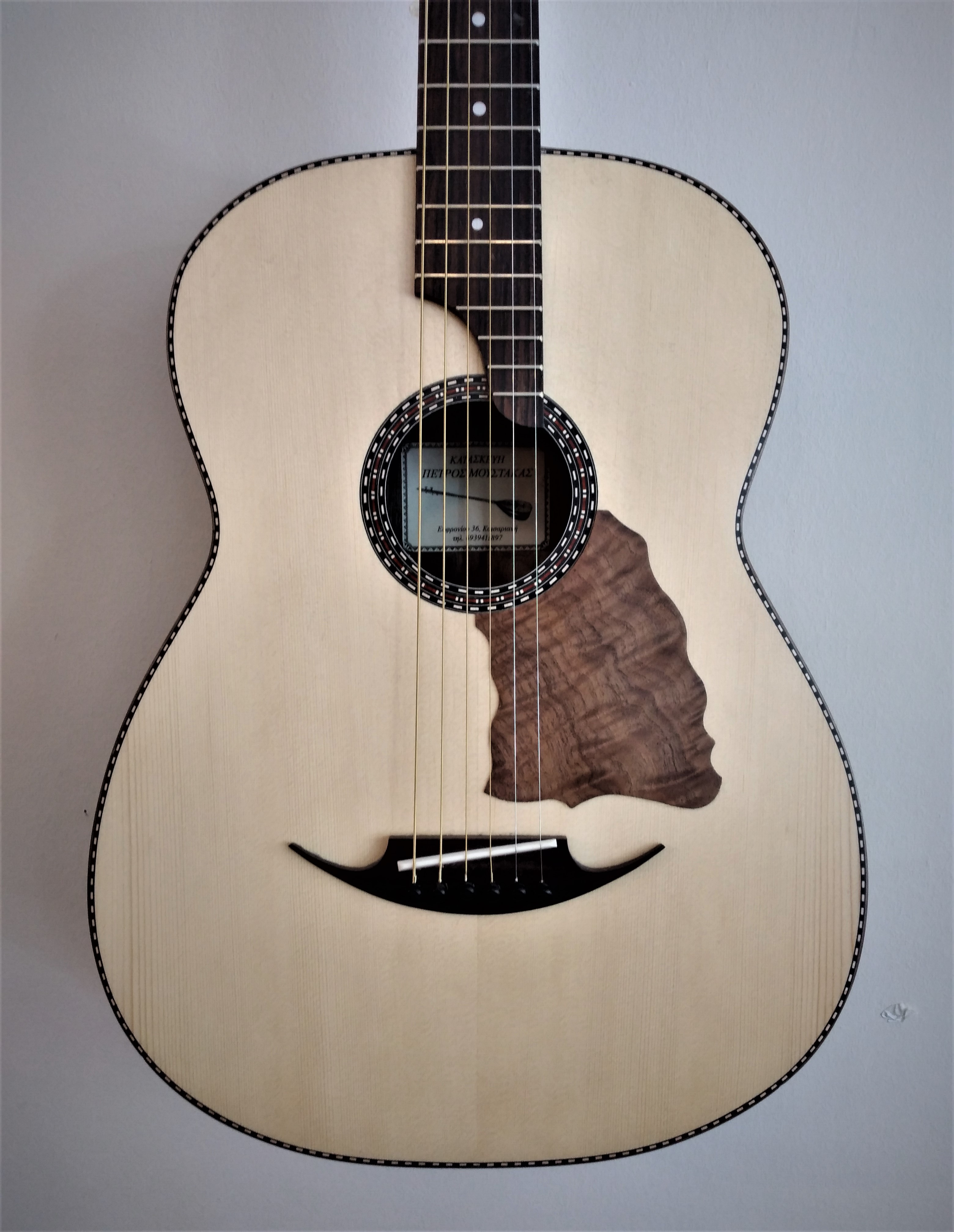 Μήκος χορδής: 63 cm. Σκάφος: καρυδιά, μπράτσο: αφρικανικό μαόνι με κόντρες όβανγκολ, καπάκι: έλατο, ταστιέρα και καβαλάρης: παλίσανδρος.